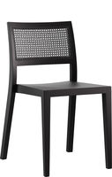 Upholstered seat, moulded plywood back, rear legs and rear cross-brace solid bentwood, stackable, optional row connector